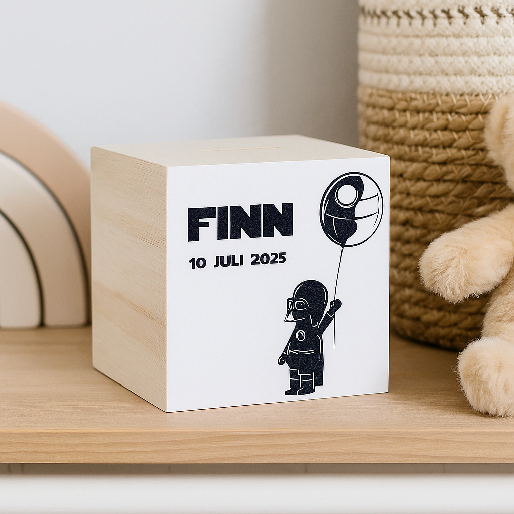 Deze houten spaarpot met deze baby Darth Vader brengt de schattige charme van het Star Wars universum naar de kinderkamer. De kleine Darth Vader siert de voorkant van de spaarpot en zal de verbeelding van de kindjes prikkelen. Het Star Wars lettertype voor de naam en geboortedatum voegt een authentiek en avontuurlijk tintje toe.