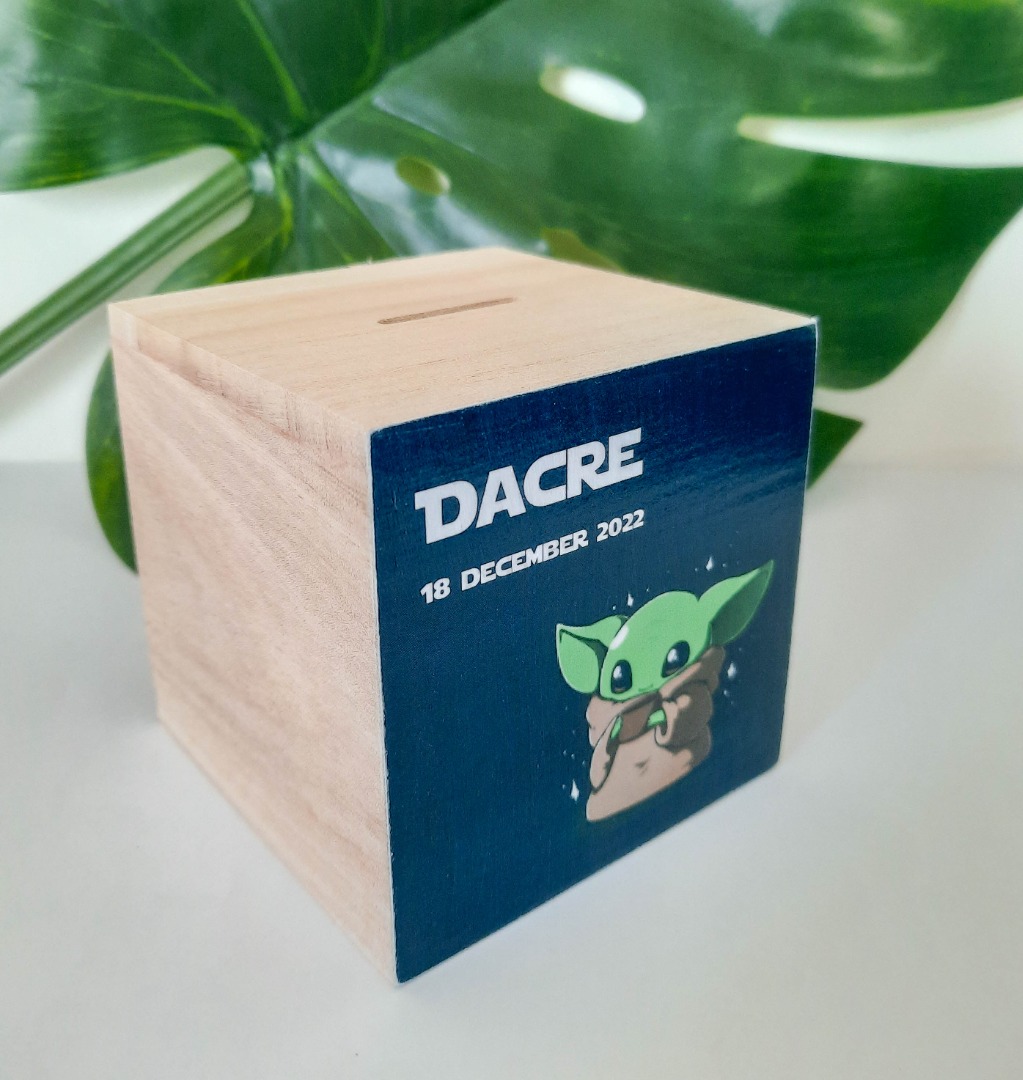 Deze houten spaarpot met Baby Yoda (Grogu) brengt de schattige charme van het Star Wars universum naar de kinderkamer. Baby Yoda, het geliefde personage uit de Mandalorian-serie, siert de voorkant van de spaarpot en zal de verbeelding van de kindjes prikkelen. Het Star Wars lettertype voor de naam en geboortedatum voegt een authentiek en avontuurlijk tintje toe.
